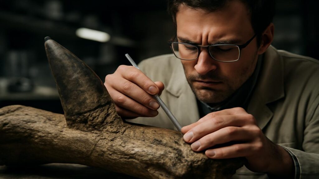 Inmitten dieser stillen, konzentrierten Arbeit taucht ein Knochen auf – ein Wirbel oder ein Beinknochen eines pflanzenfressenden Dinosauriers, im Gestein eingebacken, matt und hell. An sich nichts Außergewöhnliches. Doch als der Knochen gereinigt wird, zeigt sich eine Narbe: eine tiefe, scharfe Furche, die aussieht, als wäre sie mit einem überdimensionalen Meißel hineingeschlagen worden. Dazu eine winzige, dunkle Struktur, fest verkeilt im versteinerten Gewebe.