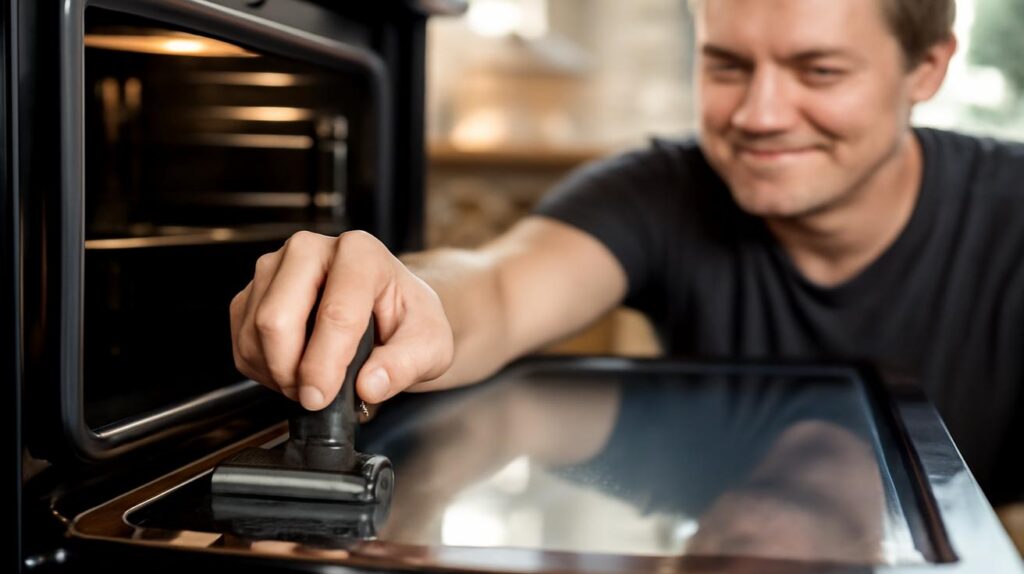 Viele moderne Öfen lassen sich mit einem kleinen Trick an den Scharnieren aushängen. Dort finden sich oft klappbare Sicherungen. Werden sie umgelegt, kannst du die Tür in einem bestimmten Winkel vorsichtig nach oben ziehen und komplett abnehmen. Der Moment, in dem du plötzlich mit der ganzen Ofentür in den Händen dastehst, wirkt im ersten Augenblick leicht surreal – aber genau dann beginnt der eigentlich spannende Teil.